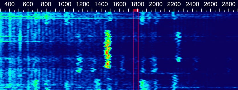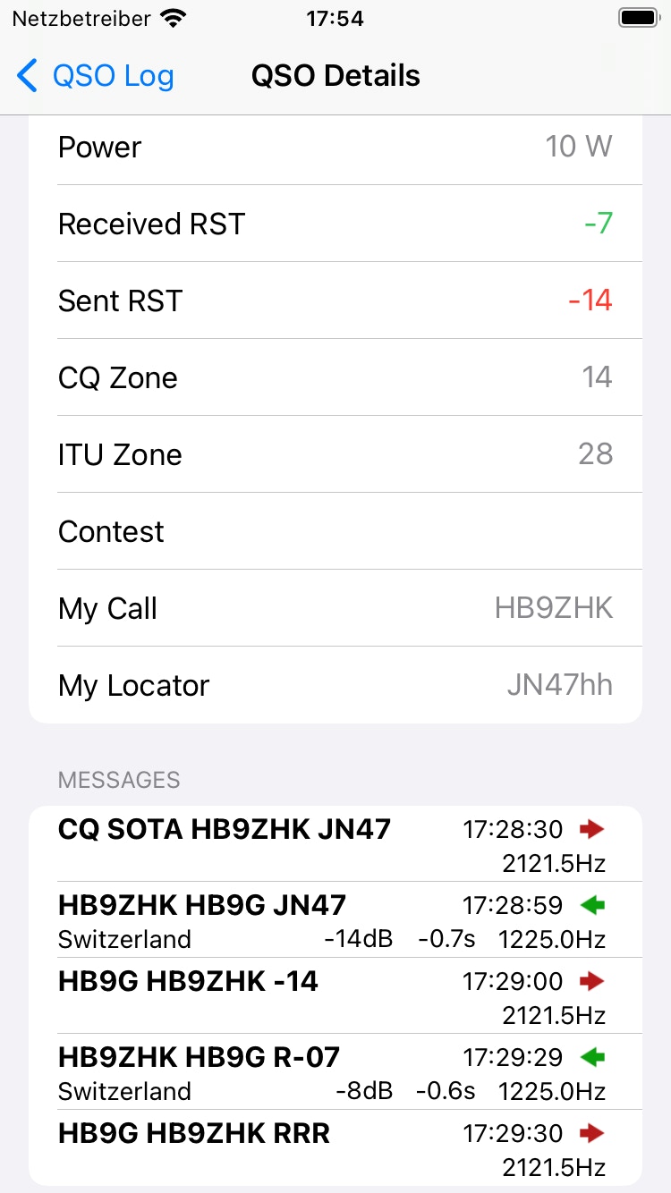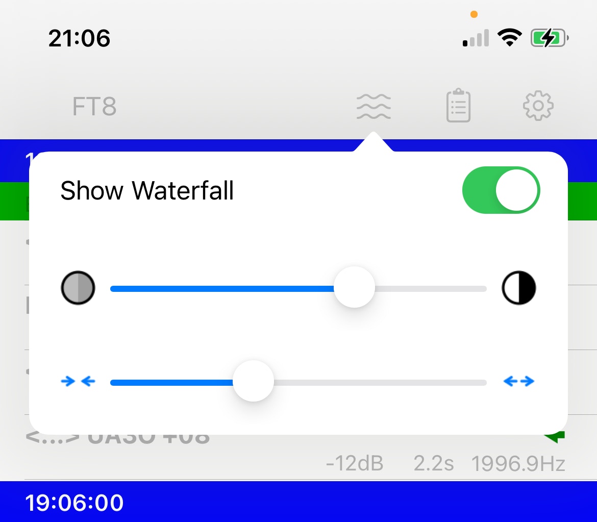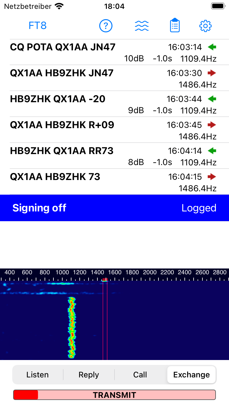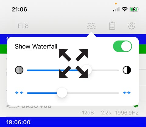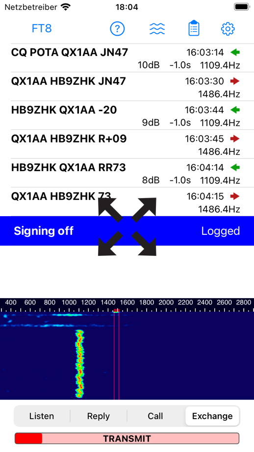 The waterfall view shows you the received (and transmitted) audio spectrum. FT4/FT8 signals appear as short vertical lines from green to red, depending on signal strength. Tap into the waterfall view to change your TX frequency (as indicated by the vertical pair of lines).