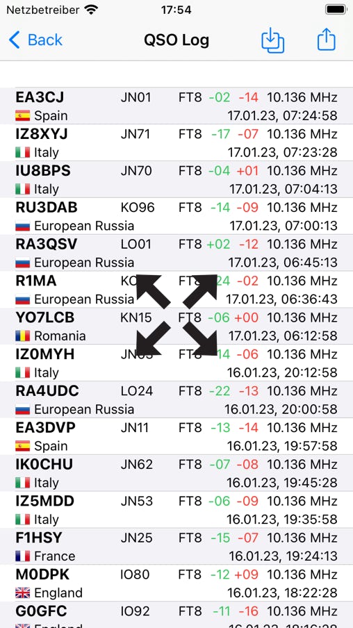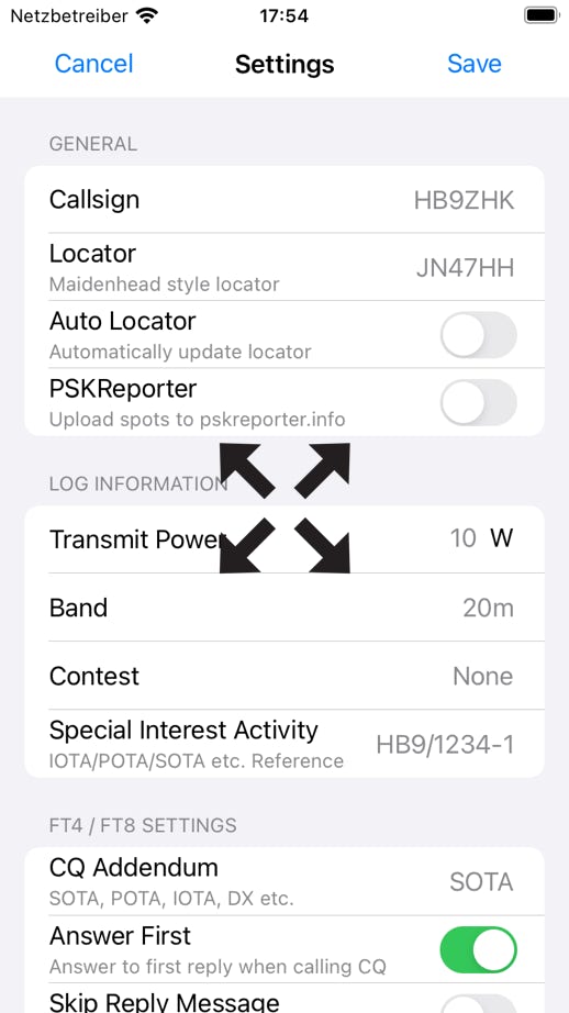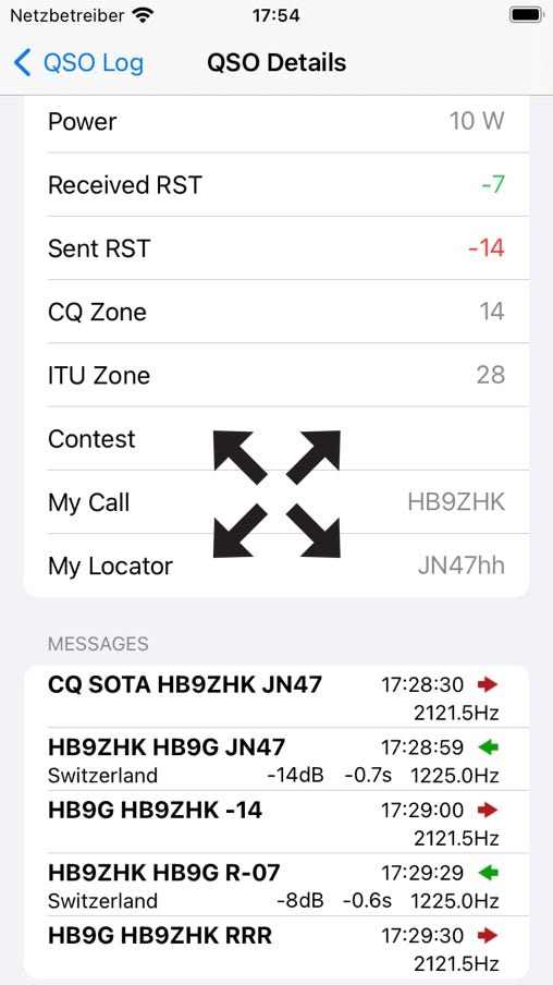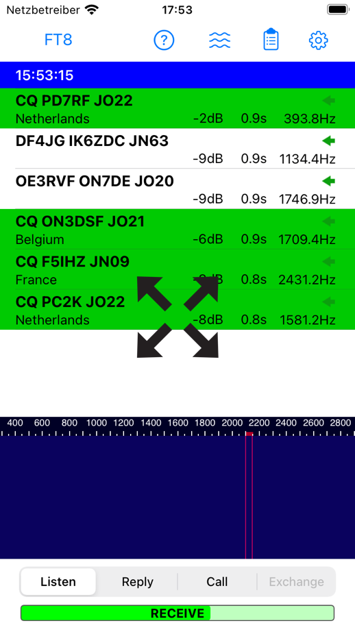 Reply: Will only display received CQ and Reply messages. Tapping on one of these will transfer you into Exchange Mode and start a contact.