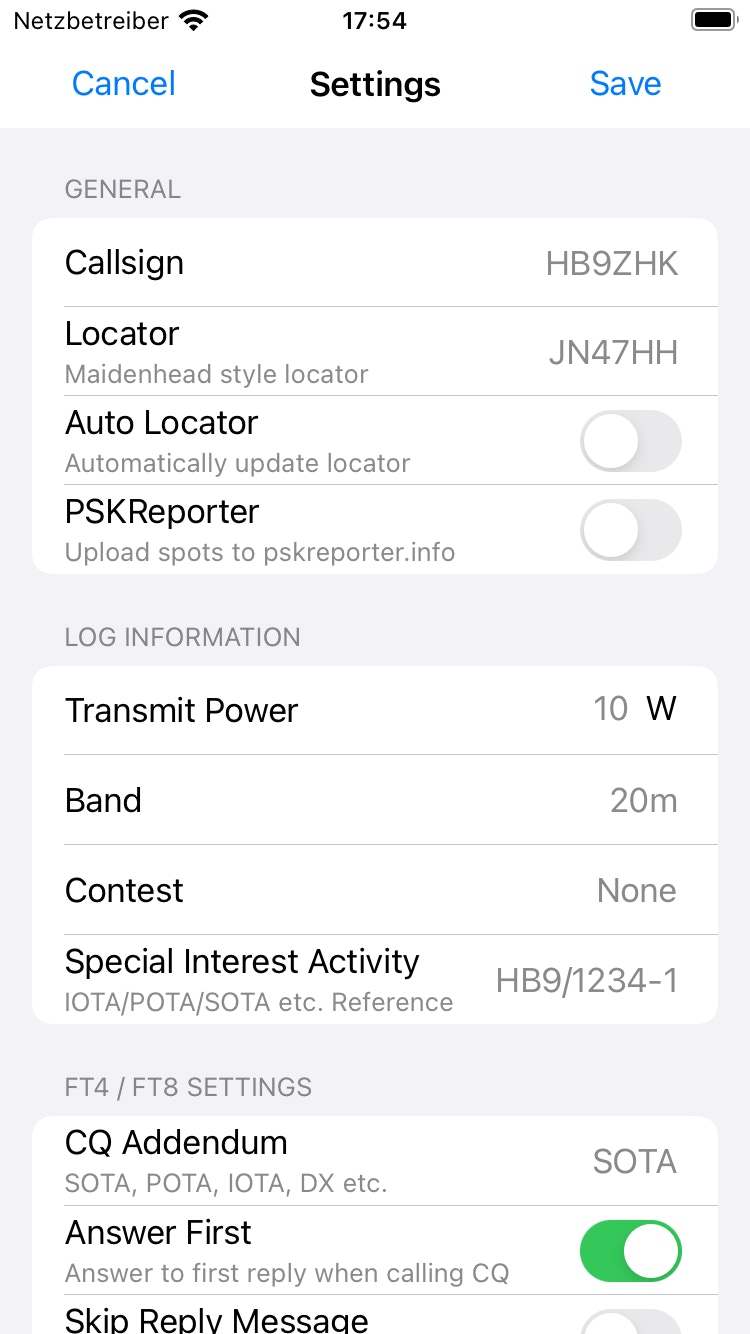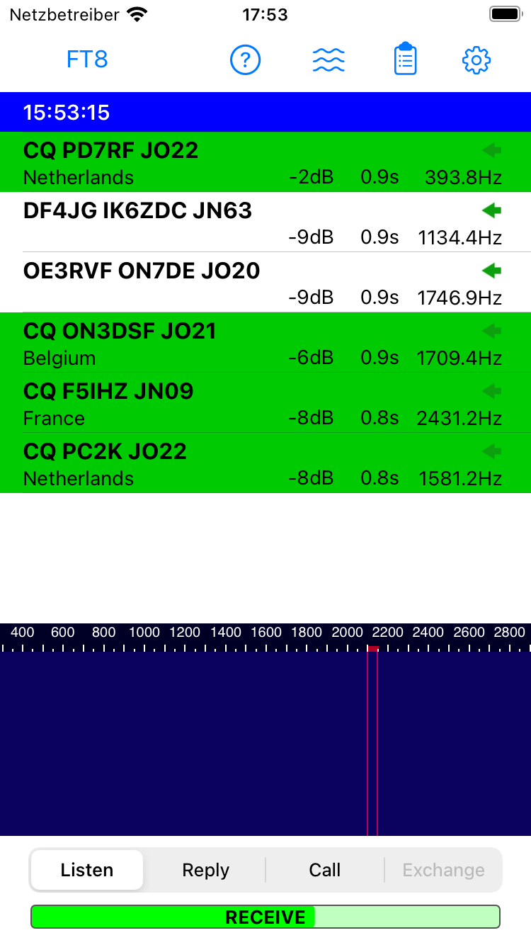 Listen: Decodes all received messages. Tapping on a CQ or Reply message will transfer you into Exchange Mode and start a contact.